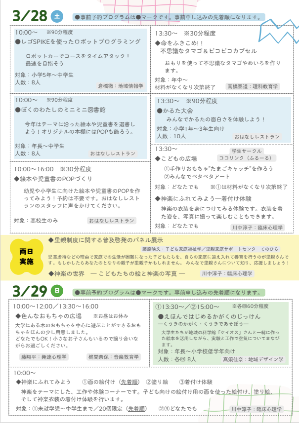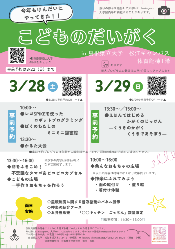 3/28(土)・3/29(日)島根県立大学松江キャンパスにて「こどものだいがく」が開催されます。