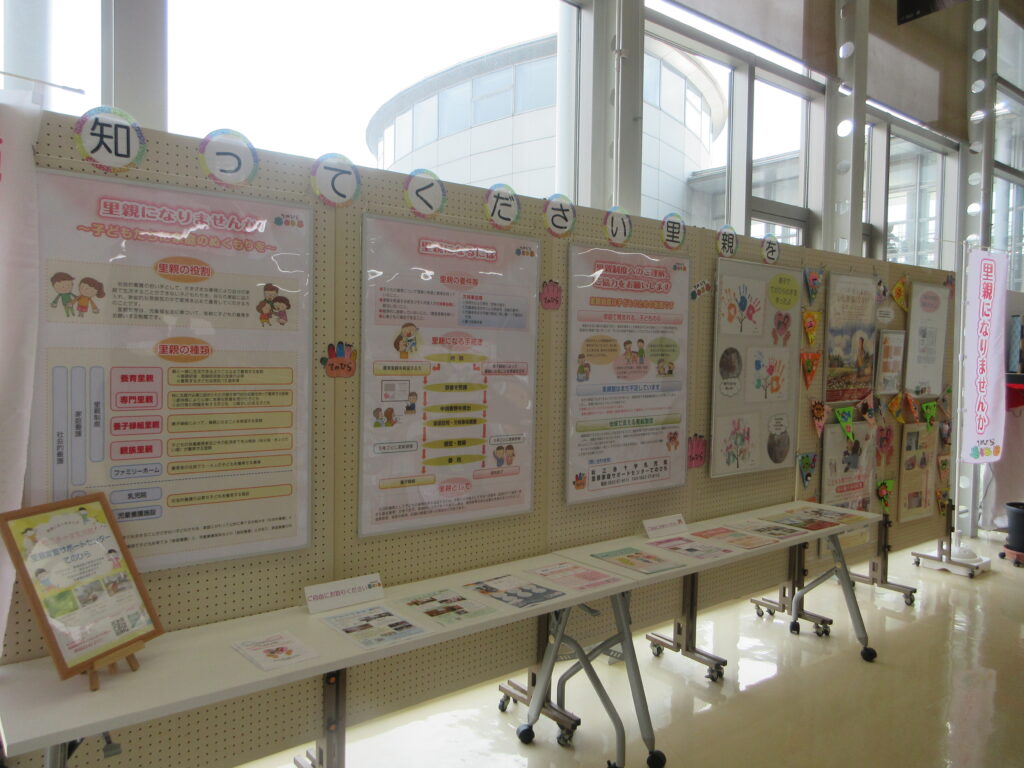 館内の「小さな図書館ふらっと」前では、「知ってください里親を」をテーマにした